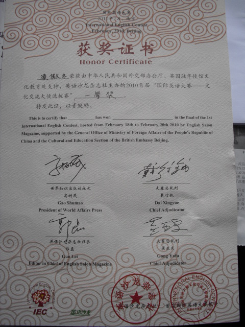 首届国际英语大赛“文化交流大使选拔赛”是由外交部主管,英语沙龙杂志社、英国驻华大使馆文化教育处共同主办的大型英语能力比赛。前外交部长李肇星先生为本次大赛题词,前外交部副部长吉佩定、国务院新闻办副局长吴伟、中国前驻联合国大使沈国放以及包括英美在内的英语国家驻华使馆主管教育的官员出席了在北京举行的大赛新闻发布会。这是国内首届以文化交流为主题的大型英语赛事,比赛内容突破了学校课本的范围,以介绍中国文化为主线,注重口头表达能力和沟通交流能力。大赛的目的是推荐选拔出未来的文化使者,促进中外文化交流,培养、储备中国对外交往的人才。 本次大赛由地区选拔赛、省总决赛以及全国总决赛组成。比赛内容涉及笔试、听力、辩论、演讲、才艺表演、看图说话以及机智问答等环节,主要考察选手对中西方文化的了解、英语口语、逻辑思维等能力。万象城官网英语071班凌傲冬顺利通过河南赛区的初赛(写作)和复赛(演讲和评委提问),和其他两名选手代表河南省(大学组)参加了2010年2月18日至21日在北京举行的全国总决赛。经过听力测试、口语交流、评委提问(即兴问答)和辩论赛等多个环节的激烈角逐,凌傲冬同学从120名决赛选手中脱颖而出,最终进入前八名辩论决赛,并获得一等奖(其他七名选手分别来自广东外语外贸大学、上海财经大学、南京大学、云南财经大学)。 万象城allwincity官网近年来一直重视英语教学的改革与创新,不断提高教学质量,积极开展“英语角”、“英语演讲比赛”等二课活动,形成了良好的教风和学风。本次大奖的获得是万象城官网英语专业长期加强语言综合能力培养的结果。