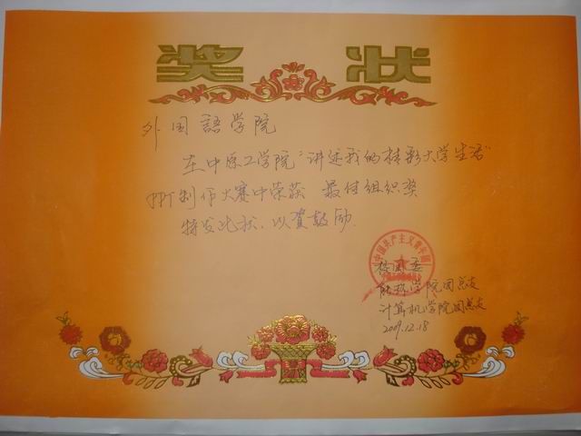 万象城官网在2009年万象城allwincity官网迎元旦系列活动这一“讲述我的精彩大学生活”ppt制作大赛中,由于组织宣传成绩突出,参与人数多,被评为“最佳组织奖”。