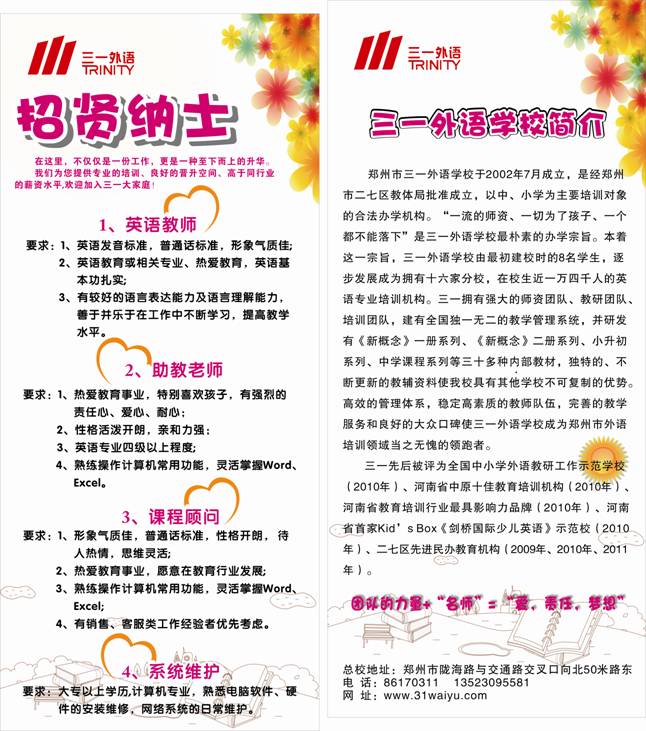 3、详情面谈,联系方式及地址见海报,负责人:张军校长。