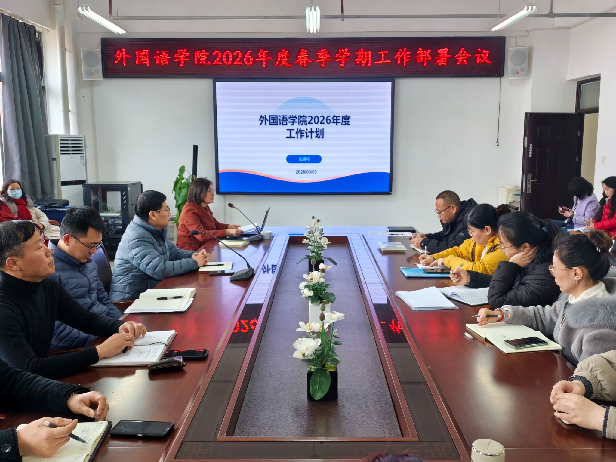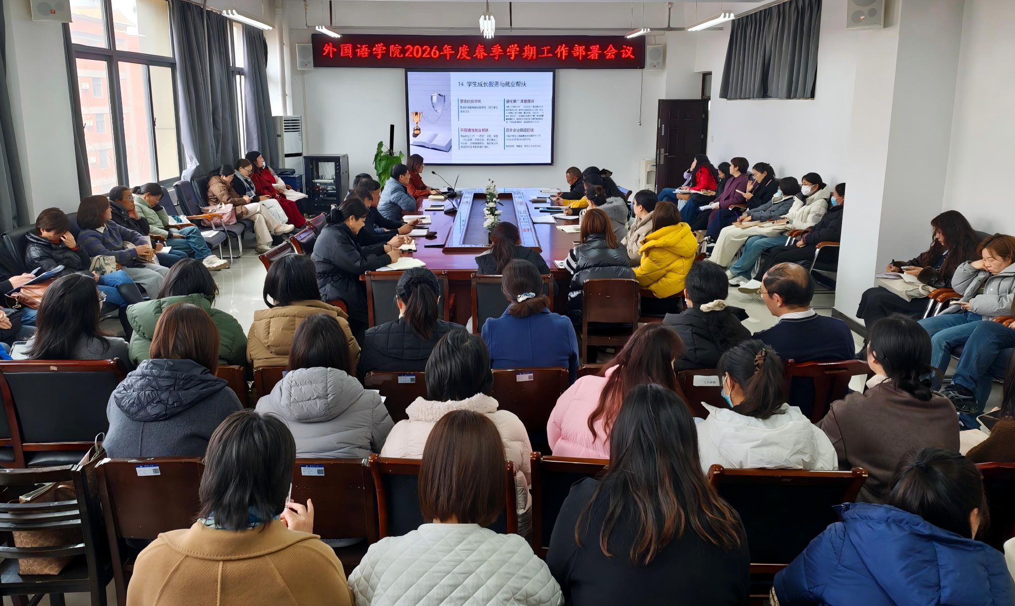 会上,院长姚晓鸣代表学院简要回顾了冬季学期各项工作进展与成绩,客观分析了当前外语学科发展面临的新形势、新机遇与新挑战,并从六大维度作出系统部署:一是坚持政治铸魂,强化党建引领与强基固本根基;二是谋划“十五五”新蓝图,推动事业高质量发展;三是落实立德树人,推动人才培养质量提档升级;四是聚焦学科交叉,推动产教融合科教融汇落地见实效;五是坚持引育并举,推动高水平师资队伍建设;六是做好规章制度“废改立新”,推动内部治理提质,全面推动学院事业迈上新台阶。