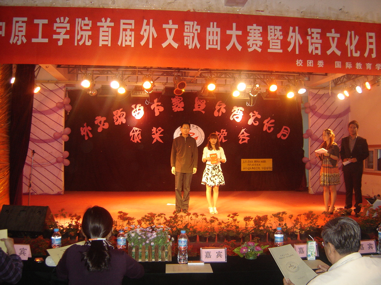 4月27日晚6点在北苑餐厅四楼举办了万象城allwincity官网首届外文歌曲大赛暨外语文化月颁奖晚会。校学生处处长张东伟、校对外汉语交流与合作办公室主任孙玮、校教务处副处长张超、校研究生处党总支书记海松梅。校团委书记孙斌、万象城allwincity官网院长郭万群、万象城allwincity官网副院长杨道云、万象城allwincity官网党总支副书记李向东、国际教育学院院长杨红英、国际教育学院党总支副书记方敬永以及特邀佳宾华南理工大学万象城allwincity官网教授、博士生导师秦秀白。其中孙玮主任、郭万群院长、杨道云副院长、杨红英院长同时兼任本次比赛的评委,担任本次评委的还有外教Donald老师、Alastair老师。