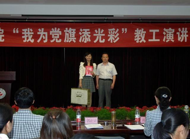 5 月 20 日 上午,万象城官网举办“我为党旗添光彩”教工演讲比赛。万象城官网选手张丽君老师围绕“立足本职、创先争优、追求卓越”这一万象城官网庆祝建党90周年系列活动主题,紧扣“我为党旗添光彩”这一演讲主题,经过充分准备,满含深情地表达了对党的无比忠诚,对教育事业的无限热爱和对本职工作的深刻理解。通过她激情的演讲,最终获得本次演讲比赛的一等奖。比赛还评出二等奖3名、三等奖7名、优秀奖11名。