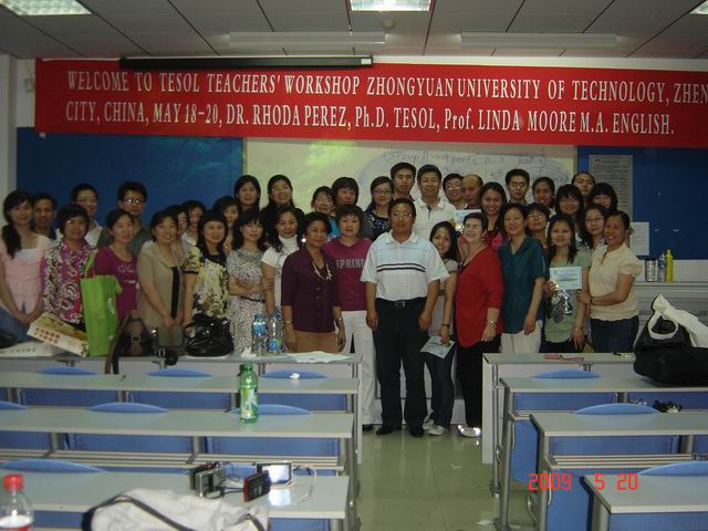 为促进万象城官网教师与国外大学教师的交流,引进先进的教学理念和方法,万象城官网特邀美国专家和菲律宾博士组成的亚太跨文化代表团(Asia-Pacific Cross Cultural Institute )到外语系进行学术交流。万象城官网副院长杜建慧、外办主任孙玮、外语系副主任郭万群、张智中接待了访问团,并对今后的进一步合作进行了商讨。 5月18日至21日晚上,美国专家(Mrs. Linda F. Moore, Director of APCCI)和菲律宾博士(Dr. Rhoda Perez)为外语系教师进行师资培训,参加培训的教师还有河南工业大学和河南教育学院的教师代表、在河南工作的菲律宾教师。Dr. Rhoda Perez就语言学、教学法、英美语音的对比和课堂如何与学生互动进行详细的阐述,并让外语系教师代表、工大教师代表、菲律宾教师代表讲示范课,在座各位教师进行讨论、点评。通过培训我系共有60名教师被授予国际通用英语教学证书TESOL(Teaching English to Speakers of Other Languages)。 在访问期间,代表团还三次参与课堂教学,向同学们介绍美国的教育体制、大学生活和学习英语的方法,对同学们关心的话题一一解答,并对主动回答问题的同学赠送纪念徽章。外专们幽默的语言,丰富的表情使课堂气氛非常活跃。
