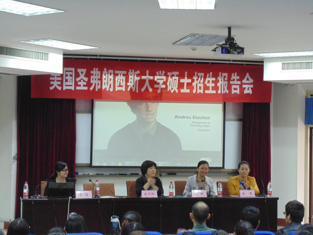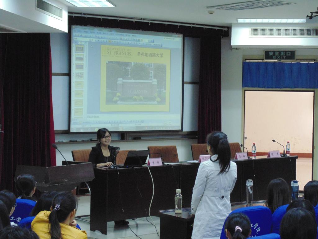 10月22日中午,美国圣弗朗西斯大学硕士招生宣讲会于万象城allwincity官网南苑4号楼311学术报告厅举行。国际教育学院院长孙玮、万象城allwincity官网副院长刘卫红、党总支副书记陈慧以及万象城allwincity官网全体辅导员、全体学生参加了此次报告会。会议由刘卫红院长主持,由圣弗朗西斯大学中国区代表李娟主讲。