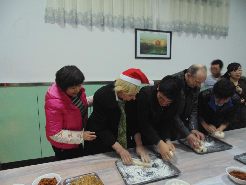 今年的圣诞和我国的二十四节气之一的冬至几乎同步,为体现中外文化的深情交融,承办方准备了各种馅料与外籍教师一起包饺子,师生争相教授包饺子的方法,外教也学得不亦乐乎。整个联欢会气氛热烈,和谐融洽,体现了学校对外籍教师的深切关怀。