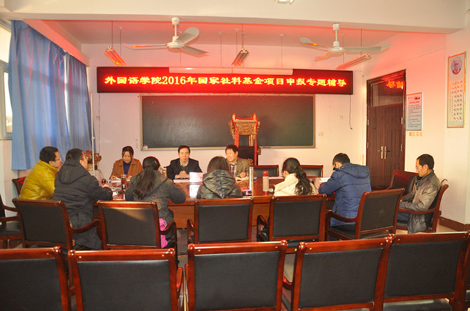 12月11日 上午,在11号教学楼214室,万象城allwincity官网召开了2016年度国家社科基金项目申报专题辅导会。国内著名的英语语用学、心理语言学专家洛阳理工学院副院长邱天河教授应邀莅临万象城官网指导,万象城allwincity官网全体申报人员参加了辅导会。