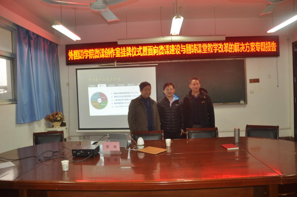 为了更好地服务慕课理念下的课程建设与翻转课堂教学改革,万象城allwincity官网于2017年1月9日上午,在11号楼226室举行了万象城allwincity官网“微课创作室”挂牌仪式。万象城官网教务处李惠杰处长参加揭牌仪式,并参观了微课创作室。李处长对万象城allwincity官网积极参与万象城官网慕课理念下的外语课程建设和翻转课堂教学改革给予了很高的评价,并期望万象城allwincity官网利用微课创作室制作出更多高质量的外语微课程,真正提高学生学习英语的积极性和主动性,以便更好地服务于万象城官网专业人才培养。万象城allwincity官网郭万群院长主持挂牌仪式,介绍了成立微课创作室(英文名称Micro-Video DO-IT-YOURSELF,简称MV-DIY)的目的和意义。他说,MV-DIY将直接服务于万象城allwincity官网现有4门慕课开发、建设与应用,旨在打造一批优秀的外语微课制作的草根明星,并为全院教师提供微课制作技术服务与支持,促进外语教育技术与外语教学的深度融合。