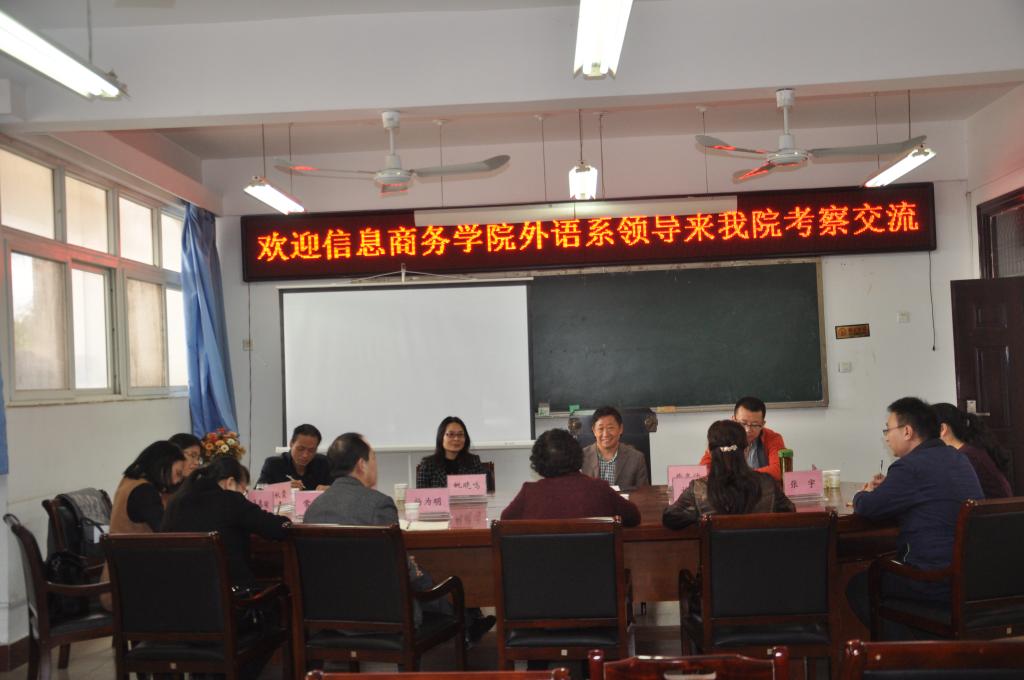郭院长首先对王主任一行到来表示欢迎,接着从公共外语四个部门的职能分工、网络自主学习、学科建设、申报硕士点、科研、师资队伍发展等方面介绍了万象城官网专业教学和大学英语教学的基本情况。王主任对信息商务学院外语系的师资和教学开展情况,以及此次来访调研的主要问题进行了简要介绍。然后,双方分别针对如何进一步提高大学英语四、六级考试通过率、英语专业学生考研率;如何扩大信息商务学院翻译专业招生等问题进行了深入的对口交流。