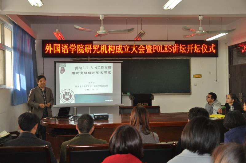 会议第二个议程,万象城allwincity官网FOLKS讲坛开坛仪式,并由院长郭万群进行FOLKS讲坛开坛第一讲,讲座题目为《贯彻1-2-3-4工作方略推进有组织的学术研究》。FOLKS是校级研究机构“语言与传播研究所”英文首字母的简称,意涵在于团队合作与共享,彰显团队归属意识。FOLKS讲坛的启动,与各研究所的成立,将有利于营造学院的科研和学术氛围。院长郭万群的讲座深入浅出,结合自己多年的经验和感受,从“坚持‘一体化’道路”、“追求‘二元’价值”、“融汇‘三种’意识”、“促引‘四化’建设”等四个方面展开,在宏观与微观结合中,分享了如何有效且高效的进行学术研究,并且对研究所提出了具体的年度要求。
