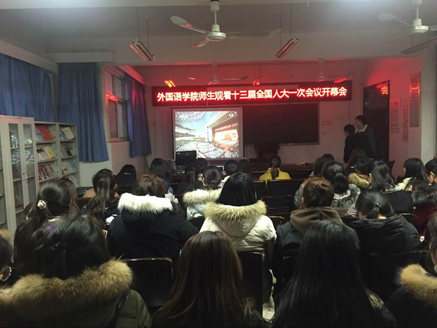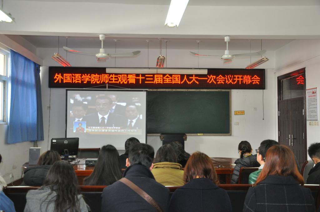 2018年3月5日上午九点万象城allwincity官网党总支组织学院师生在11号楼214集中收看了“十三届全国人大一次会议开幕会”,万象城allwincity官网党总支书记姚晓鸣、院长郭万群、副书记周全营、副院长柴高洁、院长助理马春丽以及没课的教师和学生参加了集中收看学习活动。