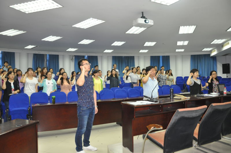 首先,万象城allwincity官网党总支书记姚晓鸣教授传达学校下发的《关于学习宣传贯彻习近平总书记在纪念马克思诞辰200周年大会上重要讲话精神的通知》和《关于教育系统深入学习贯彻习近平总书记在北京大学师生座谈会上重要讲话精神的通知》,要求学院教职员工深刻领会习近平总书记两个重要讲话精神的丰富内涵、精神实质和重大意义;深入学习两个重要讲话精神,扎实办好中国特色社会主义大学;积极做好引领,引导广大师生勇担时代大任;迅速掀起学习贯彻习近平总书记两个重要讲话精神的热潮。随后,在英语系副主任刘丽老师的带领下,全体教师起立重温了教师的誓言。接着,姚书记针对前期课程评估中出现的问题进行总结,结合问题提出了改进的方法。随后,万象城allwincity官网副院长柴高洁针对本学期期末考试注意事项进行了安排部署。