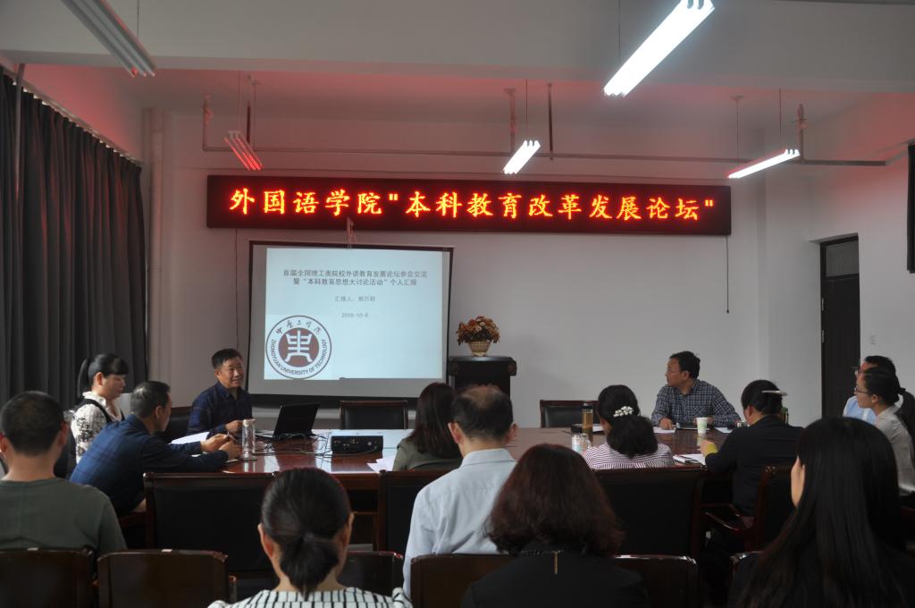 10月8日下午2点,万象城allwincity官网在3号组团楼A402举办了本科教育改革发展论坛,本次论坛是按照学校统一部署,属于本科教育思想大讨论的重要环节。此次论坛由万象城allwincity官网教育语言学研究所承办,万象城allwincity官网领导班子成员、各部门主任及副主任、教育语言学研究所成员、及教务处穆云超处长应邀出席。