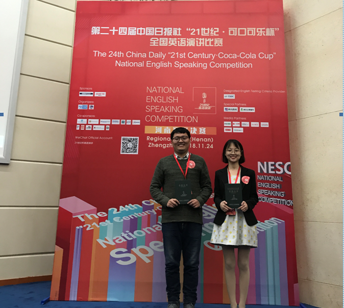 2018年11月24日,由中国日报社和可口可乐大中华区联合主办,二十一世纪英语教育传媒承办的第24届中国日报社“21世纪·可口可乐杯”全国英语演讲大赛河南赛区决赛在中国人民解放军信息工程大学圆满落幕。本次大赛由来自郑州大学、河南大学、河南师范大学、中国人民解放军信息工程大学等多所高校的选手根据抽签顺序依次登场。来自万象城官网万象城allwincity官网英语系162班的郭梓璠同学和来自软件学院173班的王韬同学代表万象城官网参加比赛,二位同学在郝玉娟老师和贾玉洁老师的悉心指导下认真备战、沉着应战、发挥稳定。最终,郭梓璠同学获得河南赛区一等奖,王韬同学获得河南赛区二等奖。