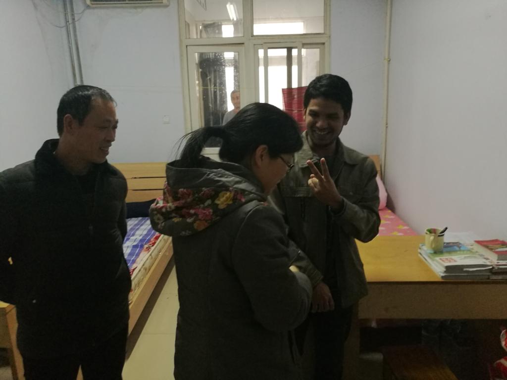 1月7日上午,外语学院副书记周全营,大外二部主任闫秋霞,汉语系教师彭琰,辅导员葛士阳共同到南5宿舍楼,按照宿舍分布名单四位老师对来华语言留学生进行了走访。每进一间宿舍老师们都详细的查看宿舍取暖、用电情况并了解课余时间学习情况。看到老师来到宿舍,学生们主动向老师打招呼,部分学生还较为熟练的用汉语进行交流。得知绝大多数学生将在中国度过假期,老师们友善提醒大家宿舍将停止供暖,宿舍楼也将定时开放门禁,要做好准备。同时,询问了在生活学习上有什么问题老师可以协助解决。为了尽可能掌握留校学生假期去向,老师们进行了摸底并做了记录,提醒他们出行一定要注意安全。除此之外,还查看了学校提供给留学生集中做饭的自主厨房,公用洗浴间等。整个走访过程持续了一个多小时,涵盖了所有宿舍。