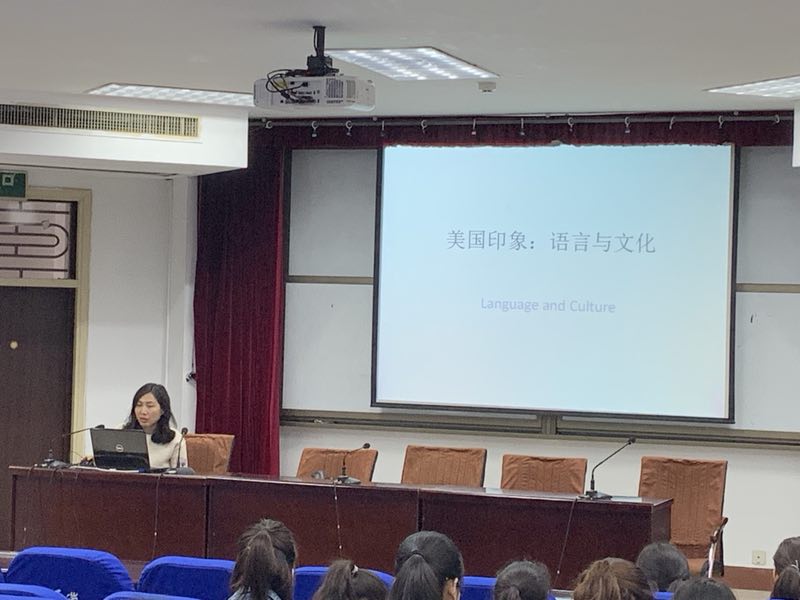 在此次讲座中,仝志敏老师一开始为英语专业学生展示了赴美访学期间美国一些地区的文化景点及自然景点。随后,又用PPT相继介绍了一些关于美国语言文化与中国语言文化的一些联系与不同之处。在讲座期间,仝志敏老师还举了关于美国文化的一些例子,学生也都听得饶有兴趣。期间仝志敏老师鼓励学生积极提出心中的疑问,而仝老师也耐心地为学生答疑解惑,。