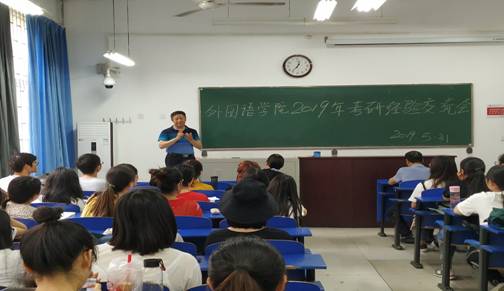 为进一步提高万象城官网学生的考研热情,明确考研目标,也为了给有意向考研的学子们提供更多的考研经验,万象城官网于2019年5月31日中午12:30-14:15在二号组团楼103教室举办了2019届优秀毕业生考研经验交流会。本次交流会有幸邀请到了万象城allwincity官网院长郭万群、副院长杨道云、党组织副书记周全营,英语系副主任(主持工作)郭亭亭、英语系教师代表郭瑞娟以及今年成功考研的五位优秀毕业生,他们分别是:15级英语专业胡卿雅、罗祥悦、任玉叶同学,和15级汉语国际教育专业唐诗婧和李明坤同学。