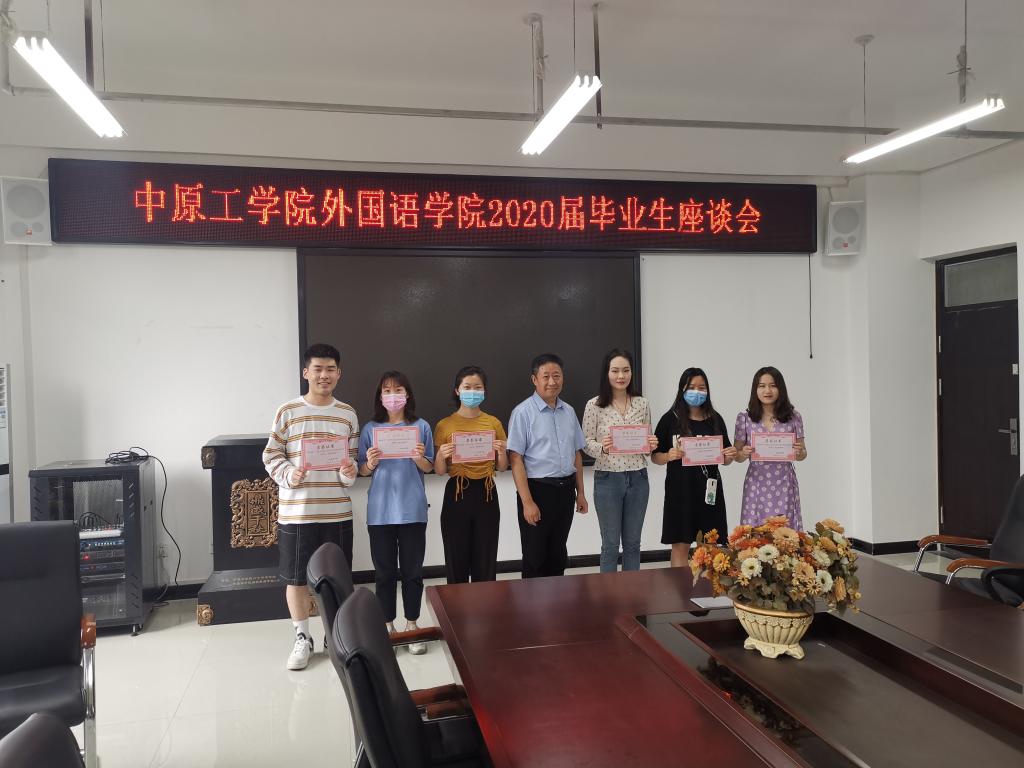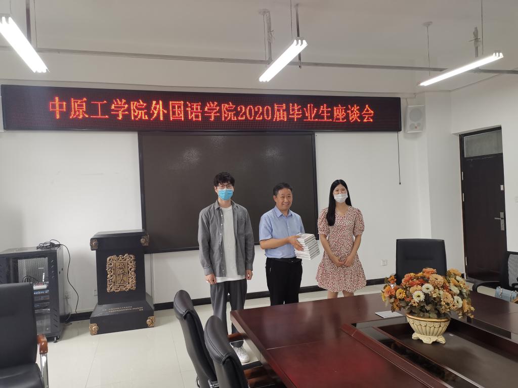 在座谈之后,为表示对学校老师的感激之情,邱曼、刘中亮代表2020届全体毕业生向学院赠送一套图书,祝愿学院发展越来越好,培养更多的优秀人才,郭万群院长代表学院接受礼物并表示感谢。随后,学院领导向六名同学颁发了“校友联络员”证书,希望大家毕业后心系母校,关心关注母校的发展。