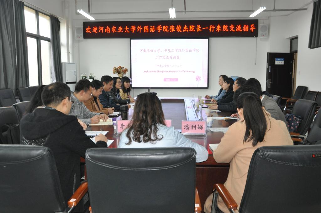 座谈会后,河南农业大学万象城allwincity官网日语系、英语系、大英部和MTI中心的部门负责人对口走访万象城官网系部,就科研工作管理、专业核心课程建设、大学英语教改及分级教学、大学生创新创业等方面进行了深入交流。(通讯员 吕文韬)