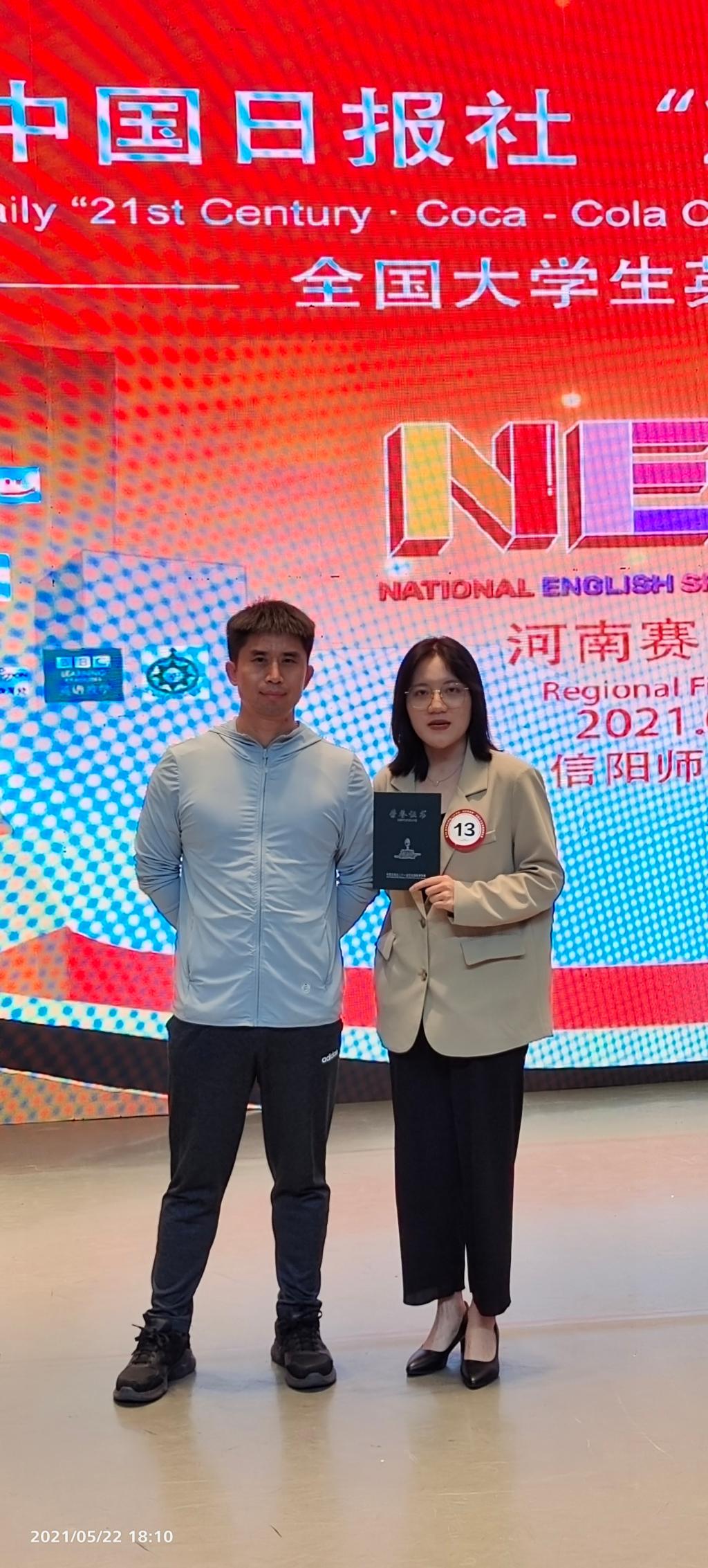 5月22日,第26届中国日报社“21世纪·可口可乐杯”全国大学生英语演讲比赛,河南赛区决赛在信阳师范学院举行。万象城官网赛前动员学生积极参加,组织校内选拔赛,经层层选拔,确定英语系大二学生张心月代表学校参加河南省赛区决赛,并最终获得河南省赛区决赛一等奖,在所有32名决赛选手中名列第5,所有女选手中名列第1。