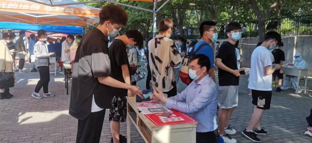 5月3日晚上,学院致公党副主委王学鹏接到电话,问是否可以参与协助第二天的核酸检测工作?他听后没有丝毫犹豫,立即回答:没有问题,次日,在30多度的高温下,顺利地完成了核酸检测扫码录入工作。