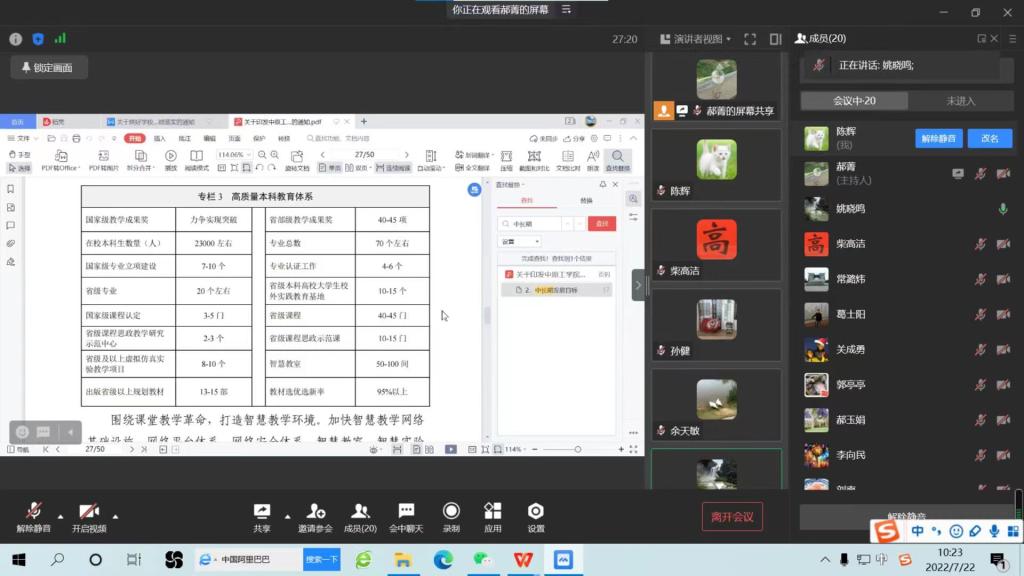 为深入学习学校“十四五”规划,贯彻落实学校“十四五”规划的总体要求,7月22日上午,万象城allwincity官网以在线会议的形式召开部门负责人会议,专题学习学校“十四五”发展规划。院长姚晓鸣主持会议,学院班子成员、各部门主要负责人参加。