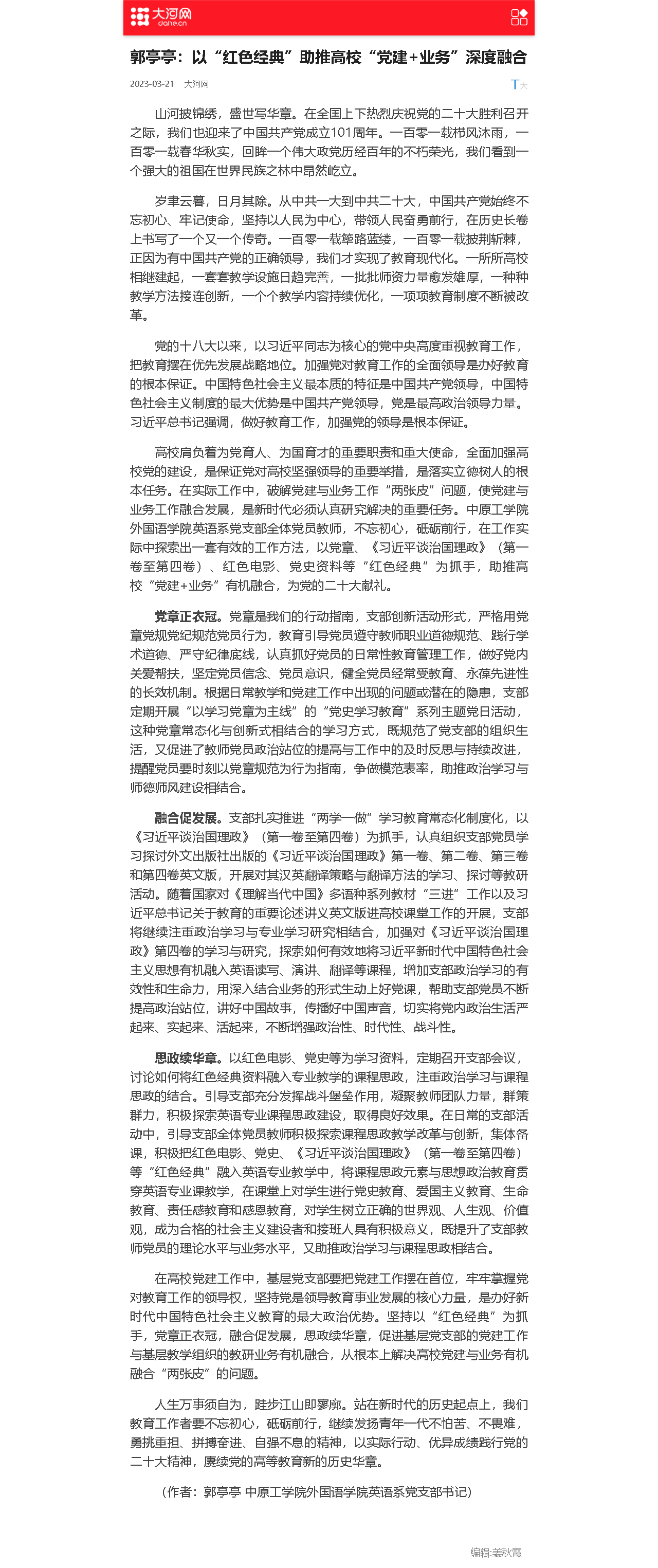 高校肩负着为党育人、为国育才的重要职责和重大使命,全面加强高校党的建设,是保证党对高校坚强领导的重要举措,是落实立德树人根本任务。在实际工作中,破解党建与业务工作“两张皮”问题,使党建与业务工作融合发展,是新时代必须认真研究解决的重要任务。万象城allwincity官网英语系党支部全体党员教师,不忘初心,砥砺前行,在工作实际中探索出一套有效的工作方法,以党章、《习近平谈治国理政》第一卷至第四卷、红色电影、党史资料等“红色经典”为抓手,助推高校“党建+业务”有机融合,为党的二十大献礼。