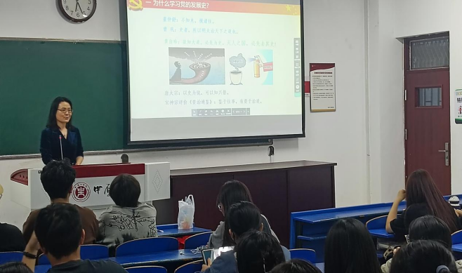 4月20日,二号组团楼110教室,姚晓鸣为同学们讲解中共党史。她带领同学们回顾了党从无到有,由弱到强的艰辛历程。使同学们认识到我们党在革命的道路上,即使面对再多的艰难困阻,也始终不畏艰难,努力奋斗,通过不懈的努力终将会成功。告诉同学们党的这种精神对于一个人、一个国家、一个民族都非常重要。