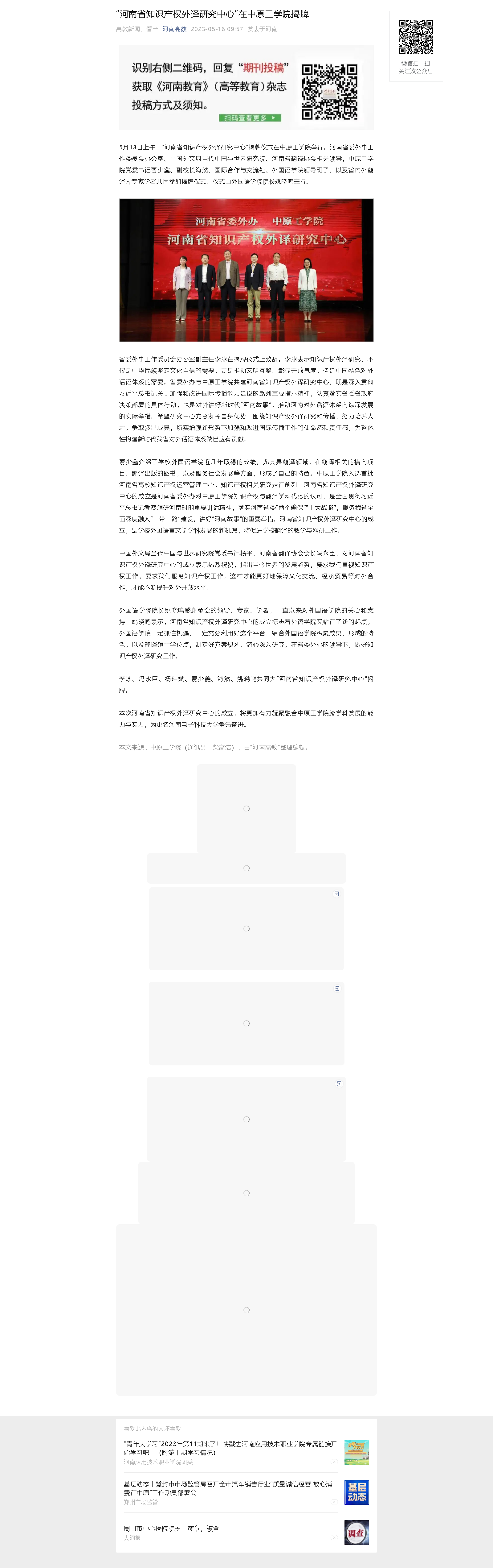 本次河南省知识产权外译研究中心的成立,将更加有力凝聚融合万象城allwincity官网跨学科发展的能力与实力,为更名河南电子科技大学争先奋进。(通讯员:柴高洁)