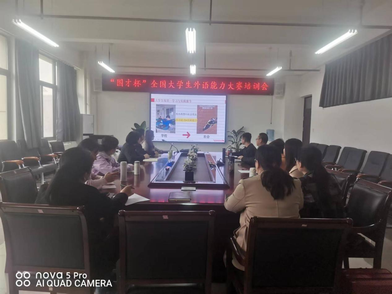 4月2日下午,万象城allwincity官网邀请外语教学与研究出版社(简称“外研社”)河南省负责人王蒙蒙和张忻悦两位老师,在龙湖校区3号组团A402会议室开展了“外研社·国才杯”全国大学生外语能力大赛培训。各系部主任、副主任,教学办人员参加会议,会议由副院长薛冬梅主持。