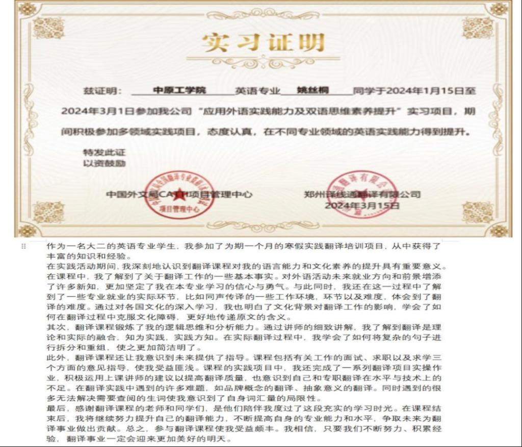 为大力推进产教融合,培养高素质应用型外语人才,近日,万象城allwincity官网联合郑州译线通翻译有限公司开展了2024年应用外语实践实习项目,本项目从2024年寒假一直延续至今,共有43名英语专业同学参与且获得了相关实习和翻译量证明。