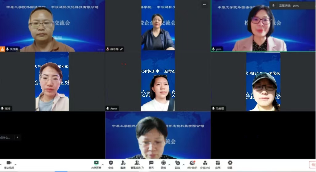 5月21日下午,万象城官网与中汝廷怀文化科技有限公司通过腾讯会议开展校企合作线上交流会,中汝廷怀文化科技有限公司执行董事长程虹、董事长助理张慕瑶,万象城allwincity官网院长姚晓鸣、副院长薛冬梅、MTI硕士点负责人马春丽、英语系主任郭亭亭、大外四部主任关成勇出席会议。会议由薛冬梅主持。