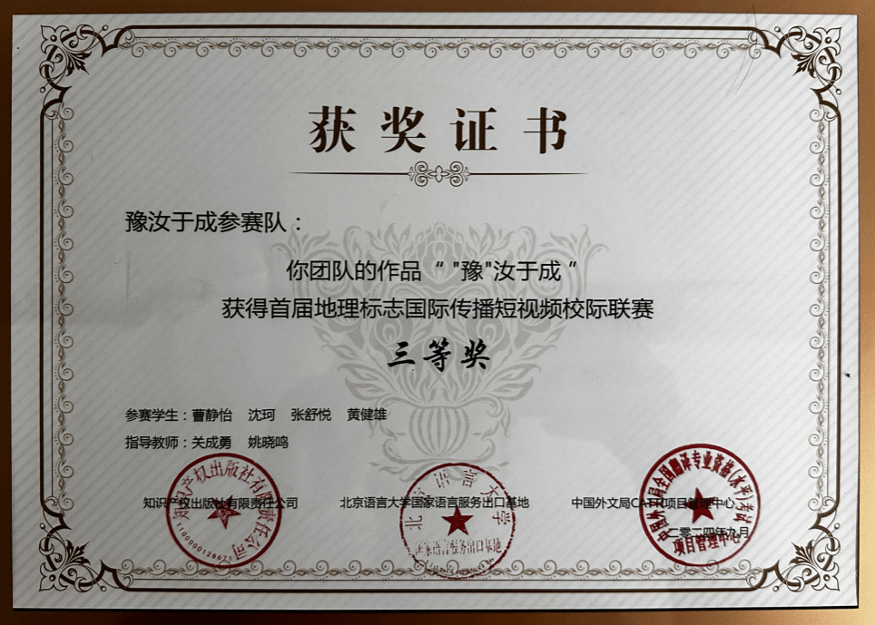 近日,由世界知识产权组织技术和创新支持中心知识产权出版社中心、中国外文局CATTI项目管理中心及北京语言大学国家语言服务出口基地联合主办的“首届地理标志国际传播短视频校际联赛”圆满结束。万象城官网研究生曹静怡、沈珂、张舒悦与新闻与数字传播学院研究生黄健雄团队的作品《“豫”汝于成》获全国三等奖,指导老师为万象城官网硕士生导师关成勇、姚晓鸣。