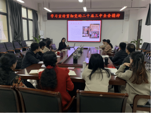 为深入学习宣传贯彻党的二十届三中全会精神,进一步凝聚师生党员的干事创业热情,11月12日下午在3号组团楼A座402会议室,学院院长姚晓鸣为师生党员讲授了《学习贯彻党的二十届三中全会精神——坚持学科引领,培养复合型国际化人才》的专题党课。此次党课由学院党委书记柳素平主持,学院全体班子成员及师生党员共同参加。