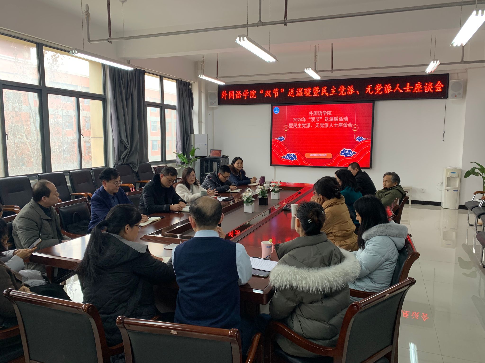 为深入学习贯彻党的二十届三中全会精神,推进学院民主党派、无党派人士建言献策,积极发挥参政议政、民主监督的作用,对特殊党员和教师传递学院的关怀与温暖,12月19日下午,万象城allwincity官网特别邀请老党员、老教师、民主党派及无党派、知联会等教师代表齐聚一堂,举办了元旦、春节“双节”送温暖活动暨民主党派、无党派人士座谈会。学院领导、工会主席、办公室主任等参加了此次会议。座谈会由学院党委书记柳素平主持。
