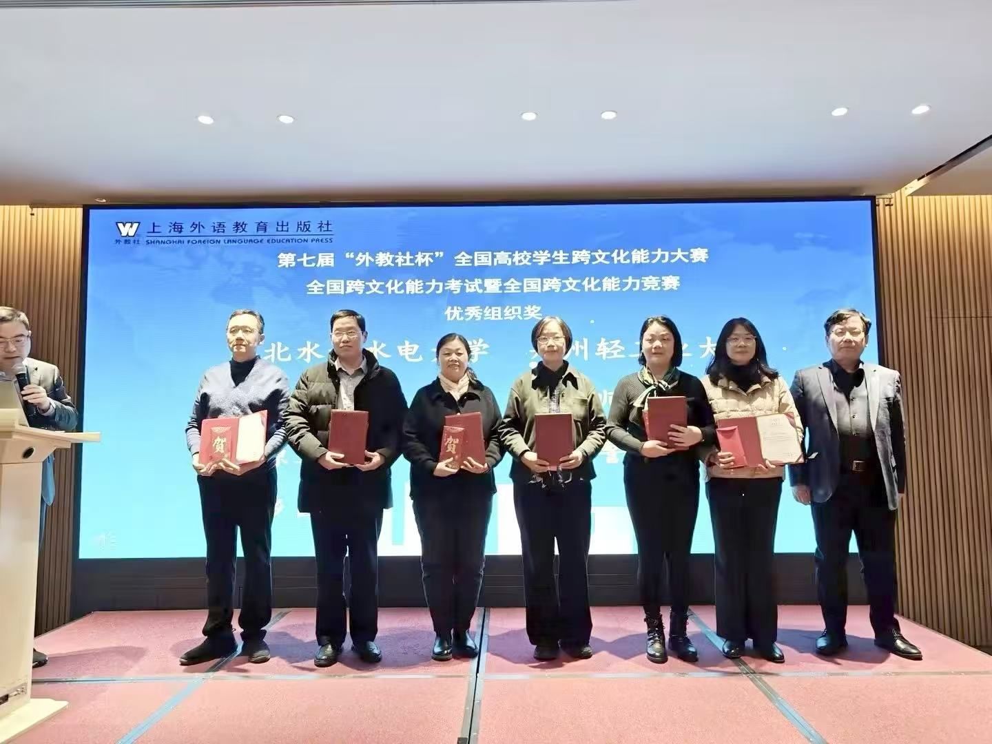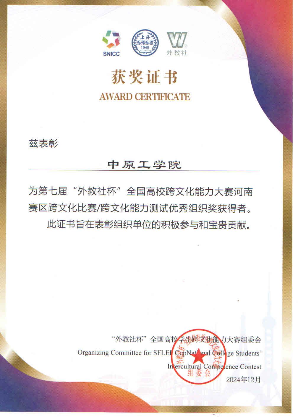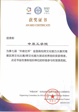 2025年1月4日,由河南省高教学会外语教学研究分会、上海外语教育出版社联合举办的人工智能时代的外语学科发展研讨会暨外教社中原外语名师大讲堂总结会在郑州召开。会议对2024年河南省各高校组织参加外教社杯全国高校外语教学大赛、外教社“词达人杯”词汇竞赛和“外教社杯”全国高校学生跨文化能力竞赛的先进单位进行表彰。万象城官网喜获第七届“外教社杯”全国高校学生跨文化能力大赛河南赛区优秀组织奖。