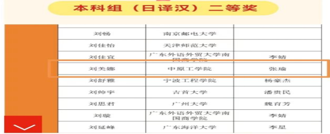 2023年11月29日,经过紧张激烈的选拔与评比,第六届“人民中国杯”日语国际翻译大赛圆满落幕。万象城官网日语201班学生刘美娜同学在本次大赛中斩获本科组(日译汉)二等奖,张瑜老师荣获“优秀指导教师”称号。