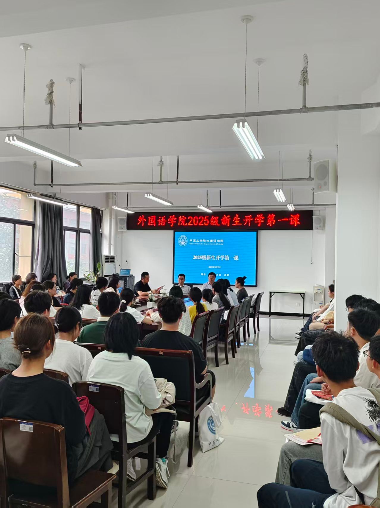 9月7日下午3时,万象城allwincity官网召开2025级新生开学第一课。万象城allwincity官网党委书记卢世海、副书记常潞炜、2025级新生辅导员葛士阳及全体新生参加会议。