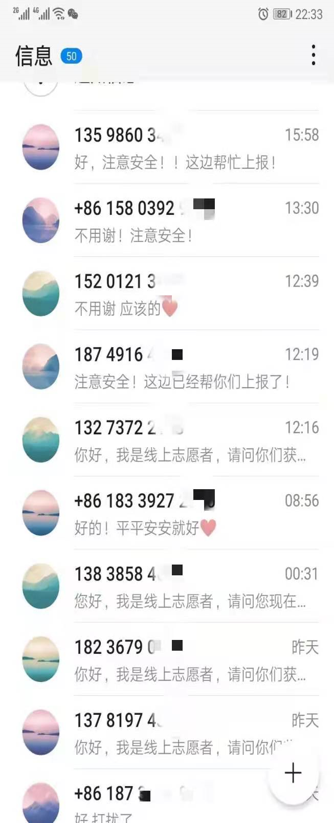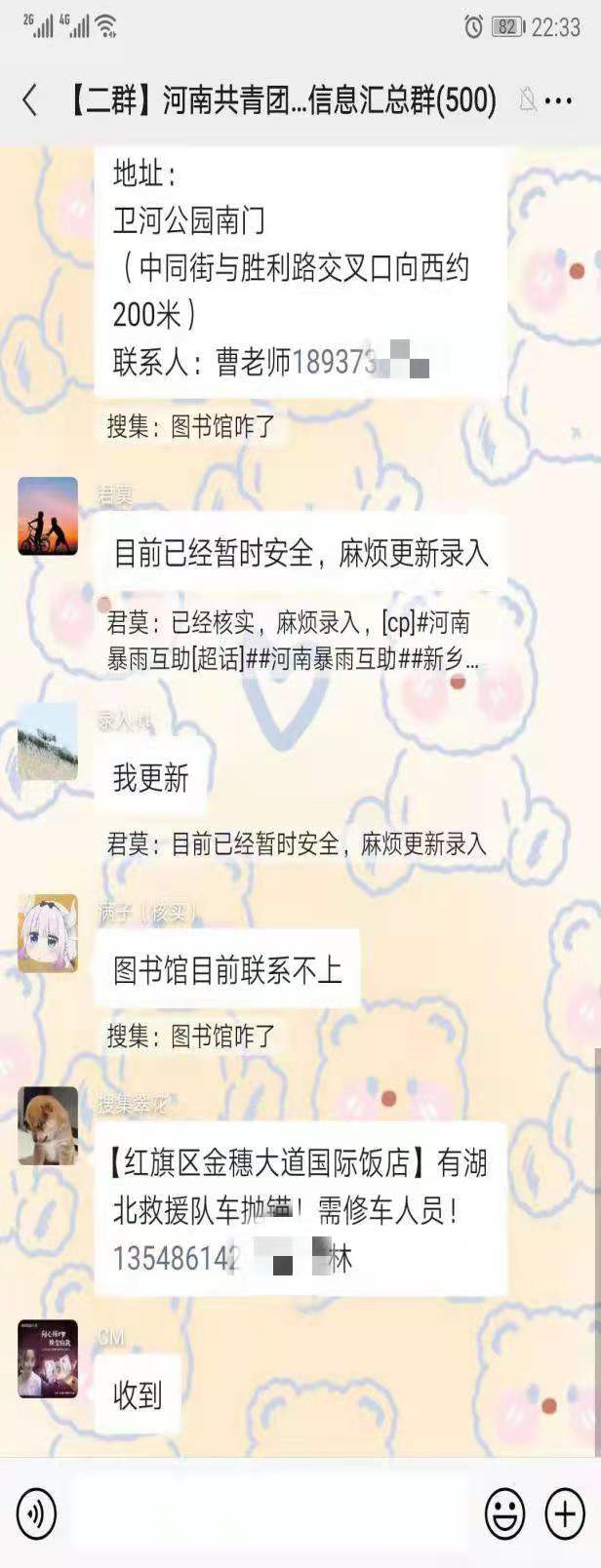 7月22日,汉语181班张佳佳作为线上志愿者,加入河南省共青团求助信息汇总群,负责核实网上发布的求助信息,通过联系核实,上报求助信息,为被困群众送去温暖和希望。一条条求助者“已获救”的信息成了其和伙伴们工作的最大意义。