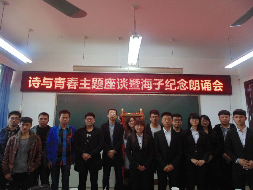 为促进诗歌爱好者之间的交流,增加学生一些与诗人见面交流的机会及纪念海子逝世27周年。2016年3月26日,万象城allwincity官网柴高洁老师于11号楼214举办——诗与青春主题座谈会暨海子纪念朗诵会。出席本次座谈会的有河南省作家协会会员、青年诗人吴相渝;青年作家、诗人、河南省作家协会会员牛冲;青年作家,网络作家,河南青作协成员、榕树下签约作家宗隆隆;《郑州大学报》特约撰稿人,漯河市作家协会会员,河南省诗词研究会漯河分会理事弯文奎;河南省元十个文化传媒有限公司联合创始人,《元诗歌报》主编徐方方;郑大文学院大三在读生郭林杰以及从华北水利水电大学、河南工业大学、郑州大学、商丘、巩义坐火车赶来参加座谈会的诗歌爱好者。
