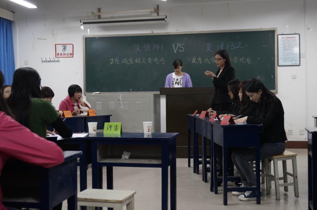 第二场,日语132与日语131,对“事业成功奋斗比机遇更重要”进行激烈讨论。在320教室:英语141与日语141开展”诚信是否是个人问题”的主题。在319教室:汉语131与英语131进行辩论的话题是“留学是否是个人问题”。