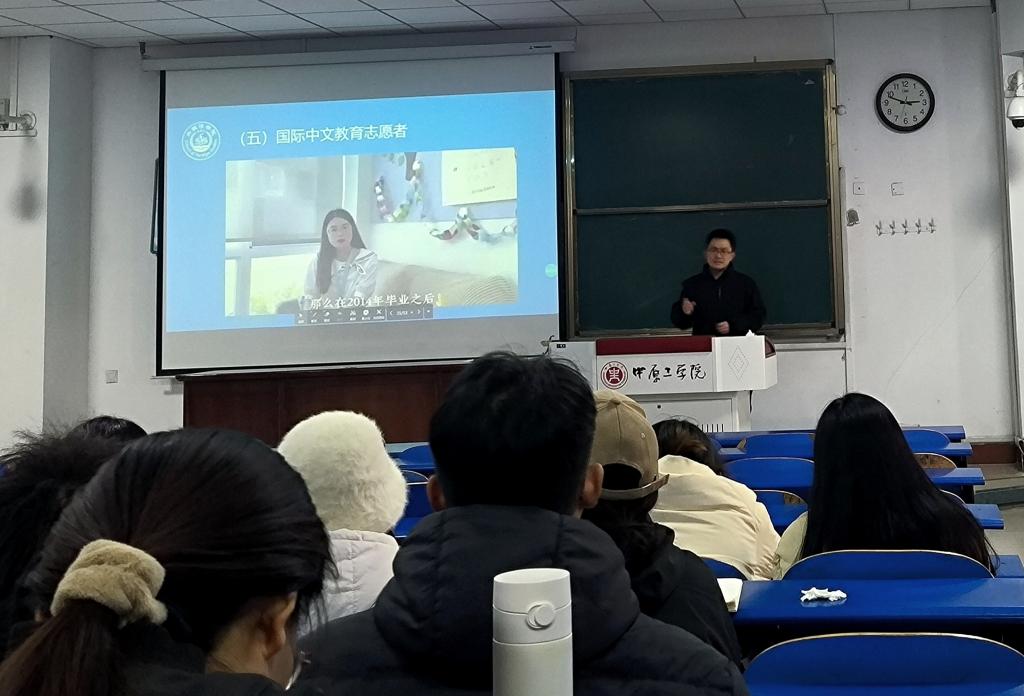 常潞炜以“锚定职业目标,练就过硬技能,成就闪亮人生”为题做职业规划辅导。他回顾了一年来2021级学生在学业发展、学科竞赛、二课活动、大学生创新创业等方面取得的成绩,分析了近十年来万象城allwincity官网学生毕业去向,详细讲解了外语类人才企业需求、国际中文教育志愿者选派、出国交换留学、考公考编、大学生服兵役等相关政策,勉励同学们立足自身实际和社会发展需要,选定职业发展方向,抢前抓早,勤奋学习,储备知识,在未来两年的各类考试及就业机会中,不留遗憾,实现目标。