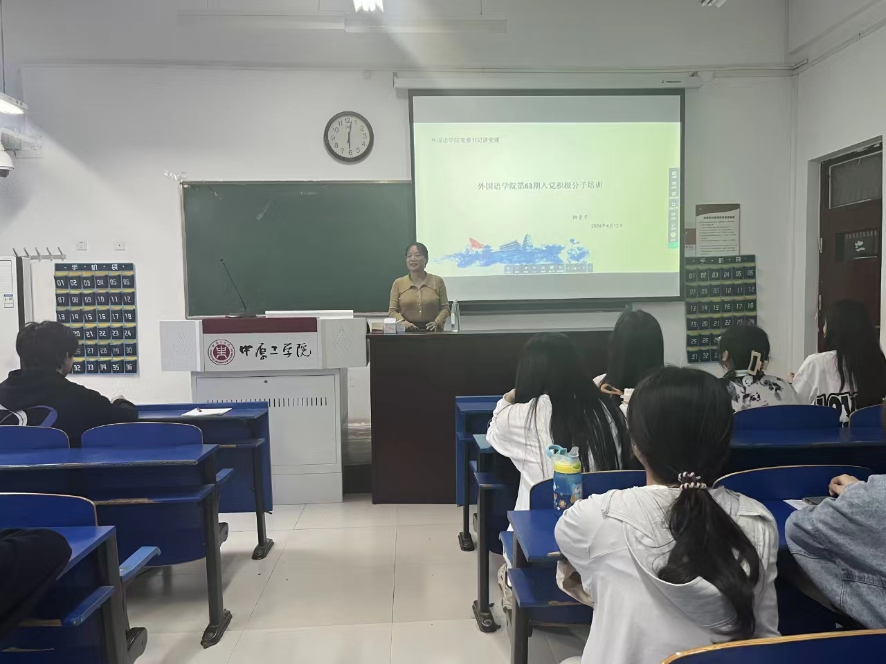 党课课堂上,柳素平为同学们讲解了中国共产党的性质宗旨、指导思想、路线方针及奋斗目标,深入阐述了中国共产党为什么是中国特色社会主义事业的领导核心。她引导同学们从波澜壮阔的百年党史中,深入体悟党的初心使命,知往鉴今,以启未来。激励大家守初心、担使命,更加坚定共产主义的理想信念。在现阶段要以青春有我、只争朝夕的昂扬姿态为实现中华民族伟大复兴的中国梦,持续贡献自己的力量。