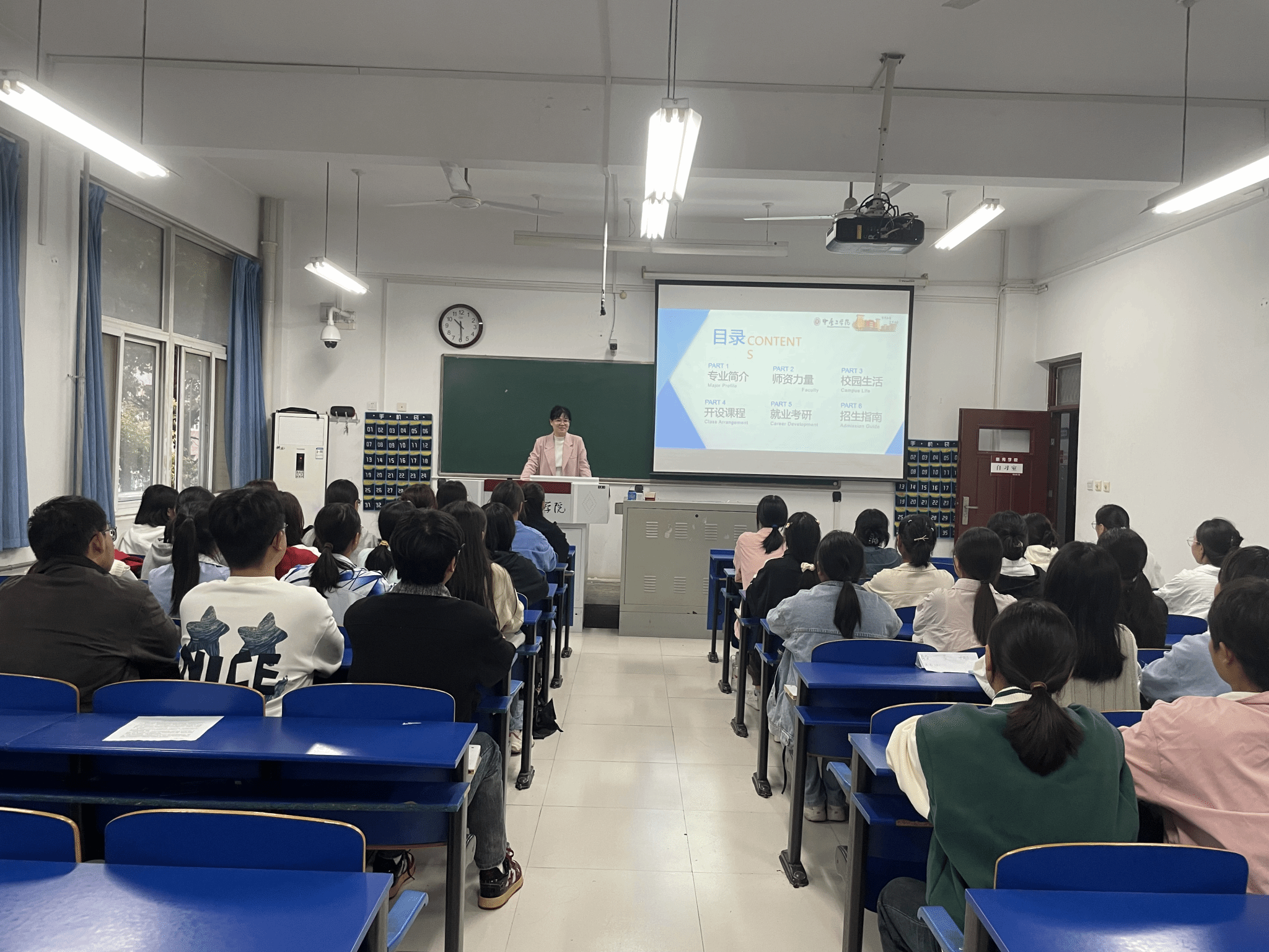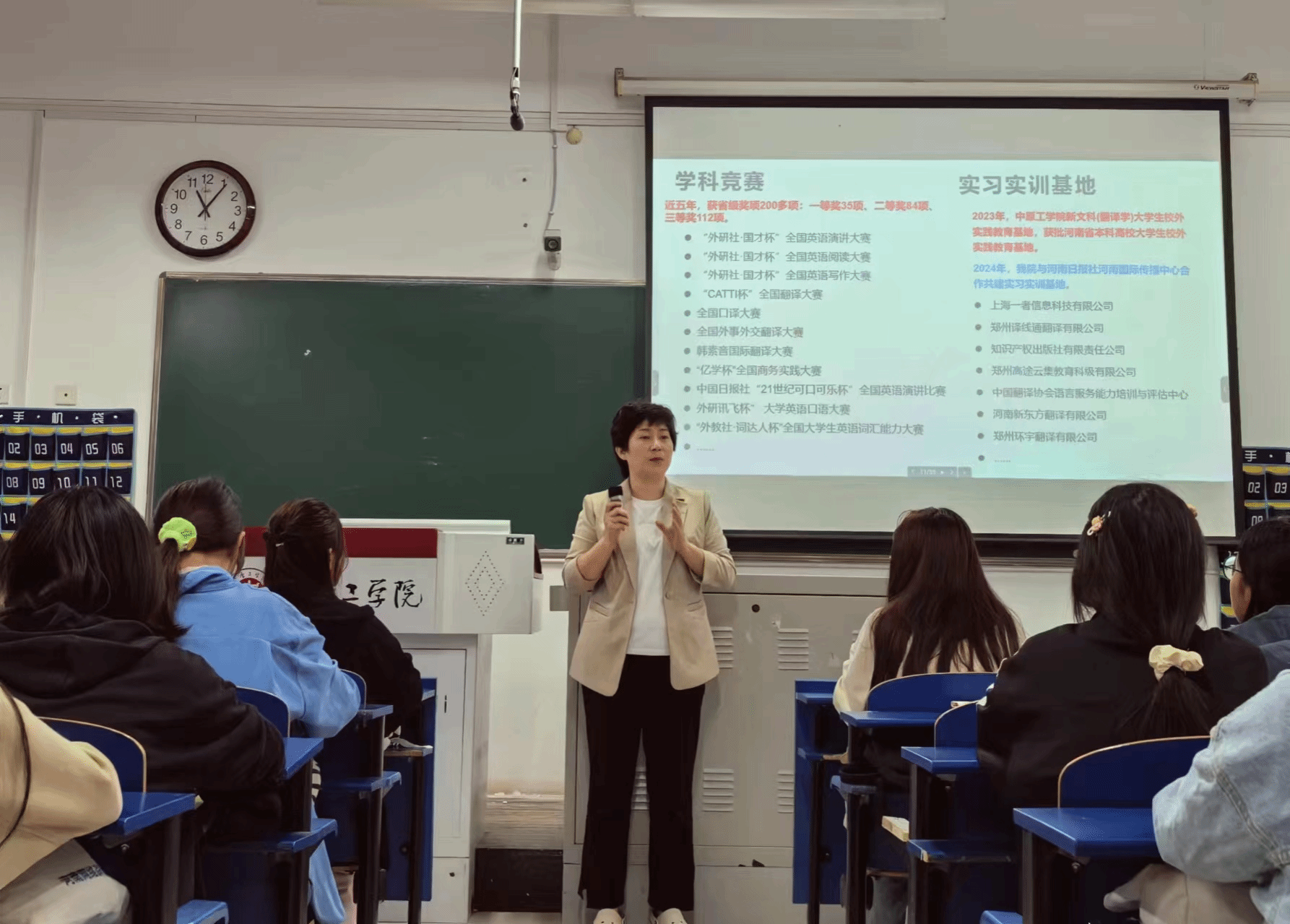首先,郭亭亭老师向同学们详细介绍了英语专业的发展历程、师资力量、开设课程、就业方向及未来发展。郭老师详细介绍了英语专业培养方案,鼓励同学们对自己的大学生活做好规划。