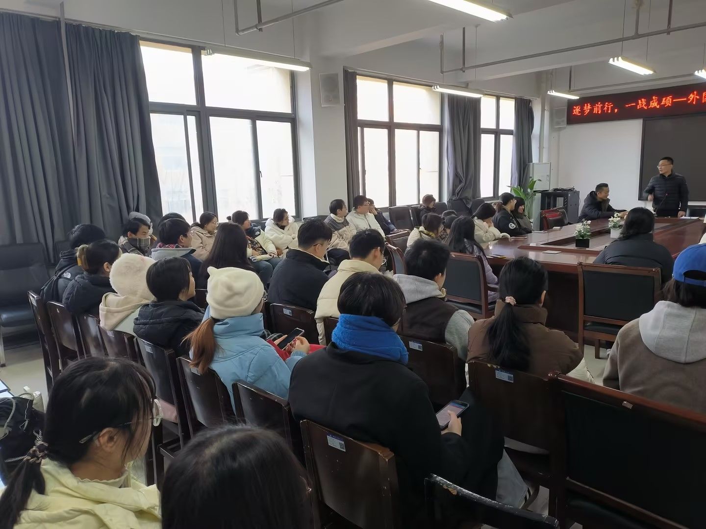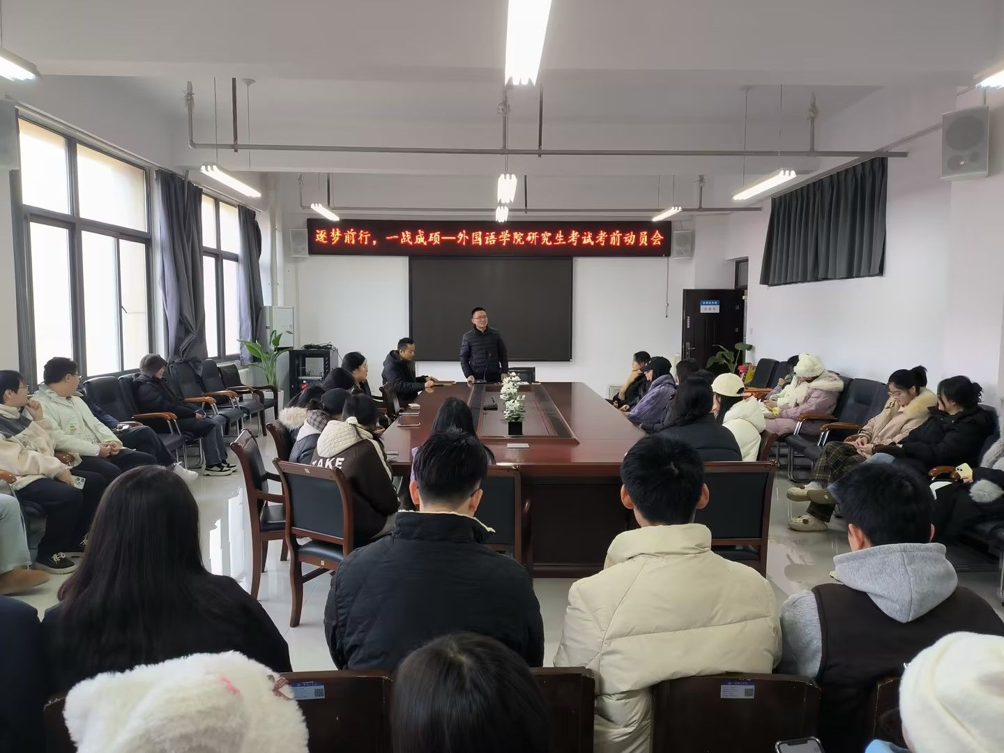 葛士阳传达了河南省2025年全国硕士研究生招生考试考生须知,提醒学生关注“研招网”“河南省教育考试院”官网、招生单位及万象城官网发布的各类信息,了解研考相关情况。柳素平鼓励同学们保持平和心态,以饱满的精神走向考场,沉着冷静答题,争取取得理想成绩。