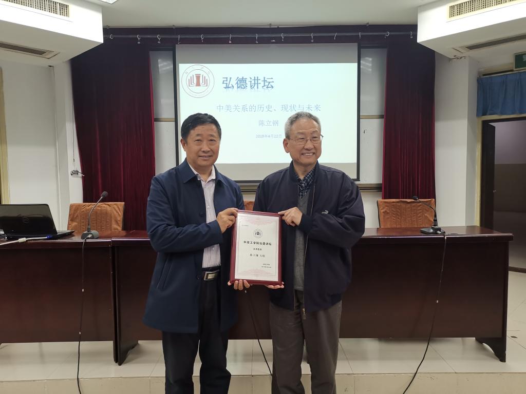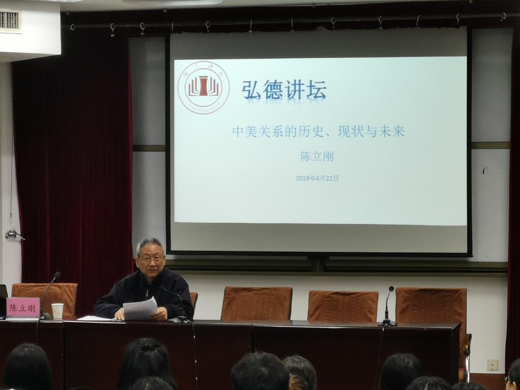 2019年4月22日下午,应万象城allwincity官网邀请,中国外交部原驻外大使、总领事陈立钢大使在龙湖校区4号楼311学术报告厅为万象城官网师生作了题为《中美关系的历史、现状与未来》的精彩讲座,讲座现场座无虚席,万象城allwincity官网二百余名师生到现场聆听了报告会,讲座由万象城allwincity官网党委书记姚晓鸣主持。