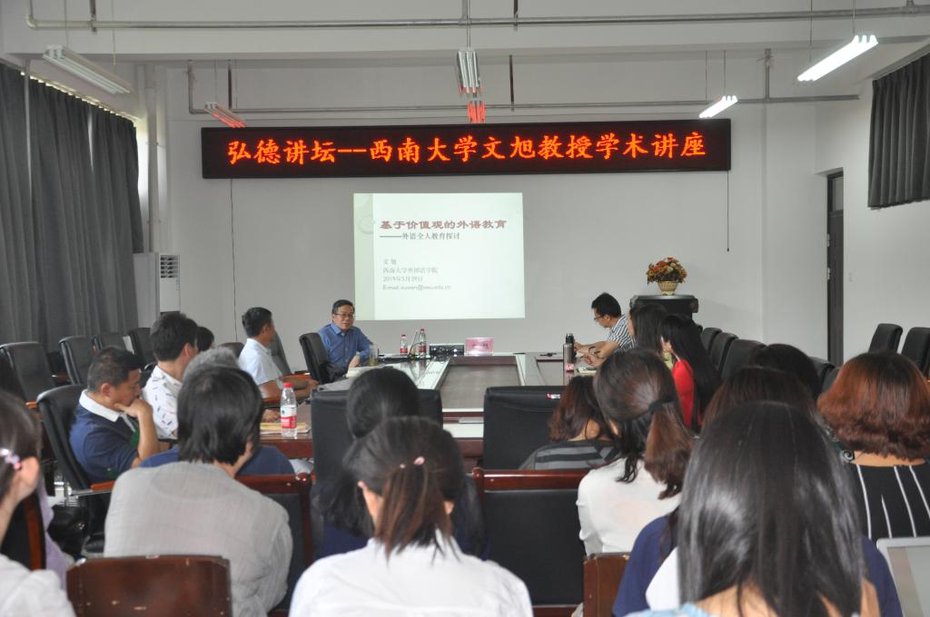 文旭教授的讲座,从习近平总书记在全国教育大会上强调的,“坚持中国特色社会主义教育发展道路,培养德智体美劳全面发展的社会主义建设者和接班人”出发,然后于教育的价值观导向、文化与价值观的关系以及价值观与外语全人教育解读等几个方面详细展开。文旭教授指出,世界各国的教育目前都在从以能力为导向转向以价值观为导向,而教师不仅承载着传播知识、传播思想、传播真理,更担着塑造灵魂、塑造生命、塑造新人的时代重任。并进一步结合《外国语言文学类教学质量国家标准》的要求,指出外语类专业培养学生的国际视野很重要,但培养学生的中国情怀、社会责任感、合作精神以及创新精神更为重要。而与此同时,教师需要建构新的教学范式,与学习者建立一种相互学习、共同创造的教学过程。教师需要以学生为中心,了解并尊重每位学生的需求。
