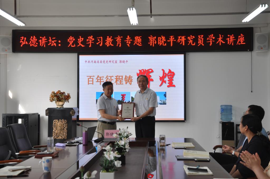 6月3日下午,应万象城allwincity官网邀请,中共河南省委党史研究室原副主任、郑州大学教授、河南省中共党史学会副会长郭晓平研究员做客万象城官网弘德讲坛,在龙湖校区3号组团楼A402,为万象城官网师生作了题为“百年征程铸辉煌—中国共产党在河南历史巡礼”的精彩讲座。万象城allwincity官网院长郭万群为郭晓平颁发弘德讲坛主讲证书。万象城allwincity官网副院长柴高洁主持讲座,万象城allwincity官网、马克思主义学院教师及部分学生党员聆听讲座。