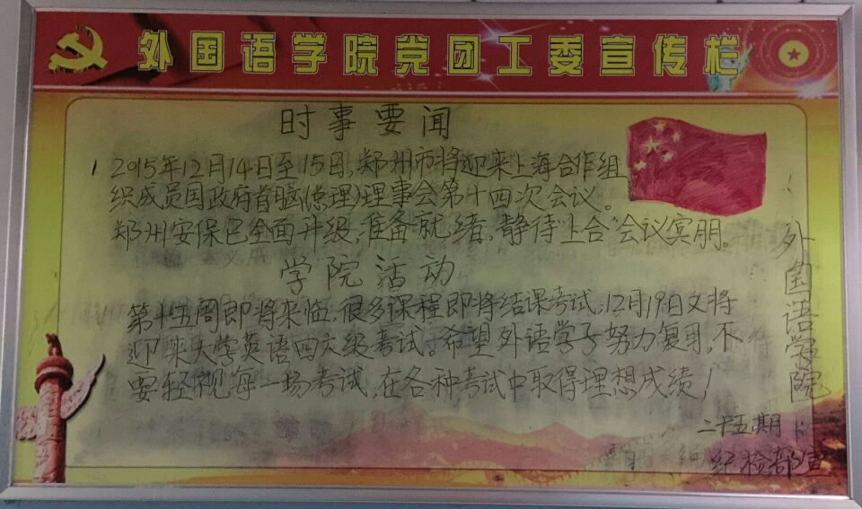 第十五周即将来临,很多课程即将结课考试;1219号又将迎来大学英语四六级考试。希望外语学子们努力复习,不要轻视每一场考试,在各种考试中取得理想成绩。