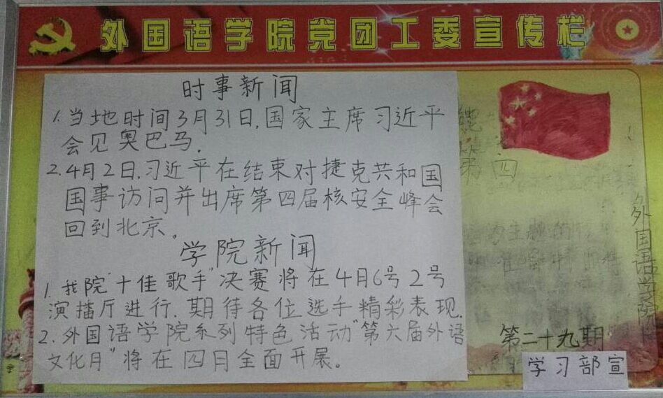 时事新闻:当地时间3月31日,国家主席习近平在华盛顿会议中心会见美国总统奥巴马,就中美关系发展及共同关心的国际和地区问题深入交换意见。在结束对捷克共和国国事访问并出席在美国华盛顿举行的第四届核安全峰会后,国家主席习近平2日回到北京。 学院新闻:万象城官网“十佳歌手”决赛将在4月6号二号演播厅举行,期待选手们的精彩表现。万象城allwincity官网系列特色活动“第六届外语文化月”将在四月全面展开。