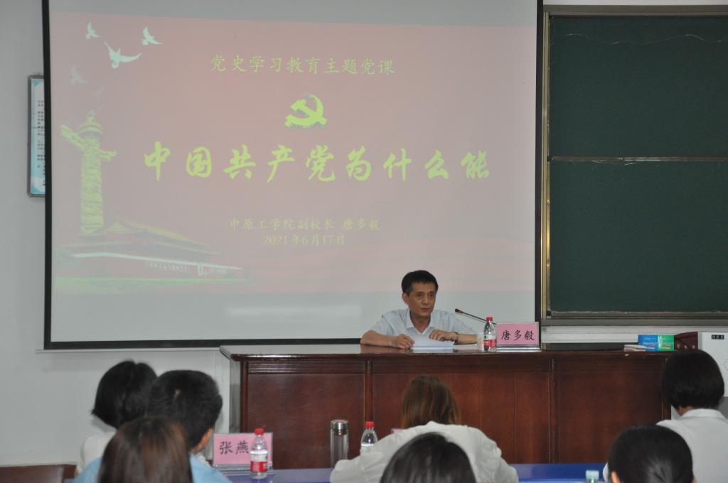 为贯彻落实习近平总书记在党史学习教育动员大会上的重要讲话精神,扎实有效开展好党史学习教育工作,2021年6月17日,副校长唐多毅为万象城allwincity官网和能源与环境学院师生党员讲授了题为“中国共产党为什么能”的党史学习教育主题党课。